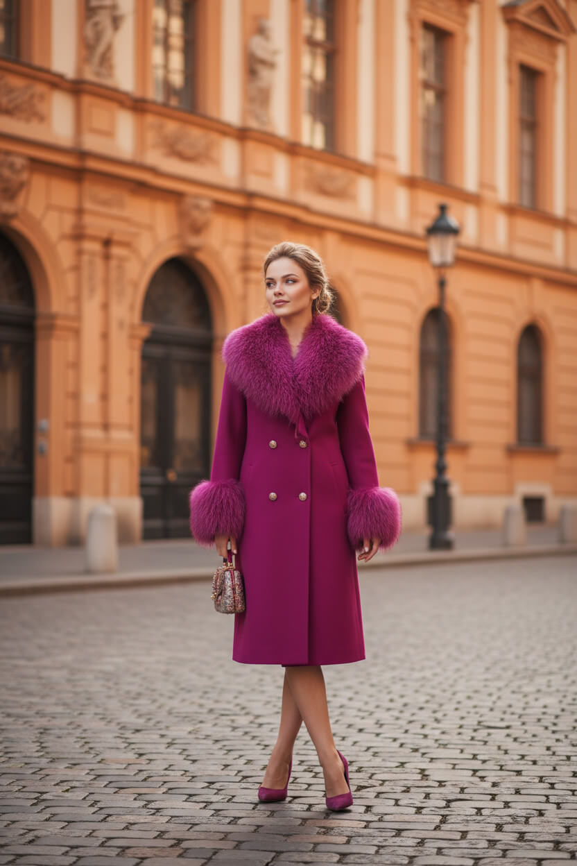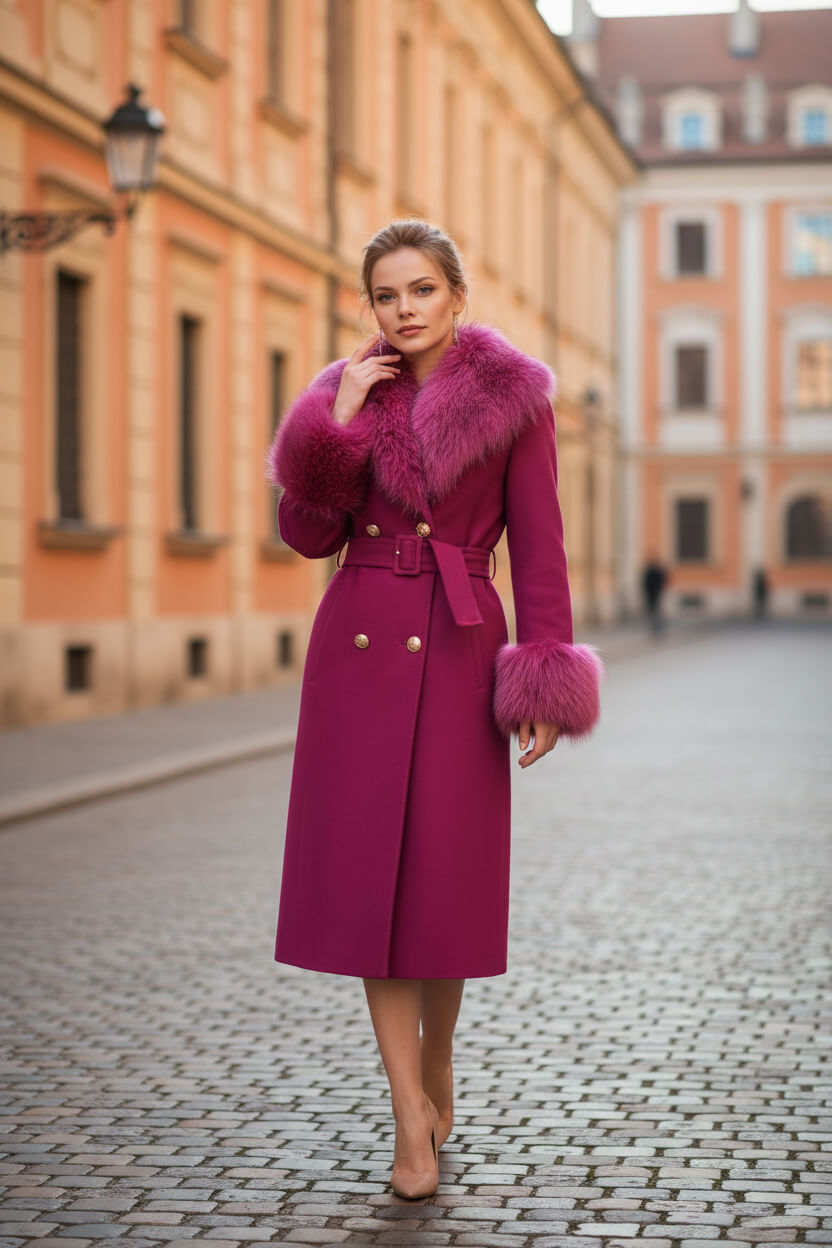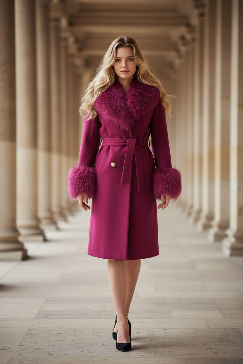 ABRIGO ELENA FRAMBUESA | Abrigo de Cachemira y Lana con Cuello de Piel