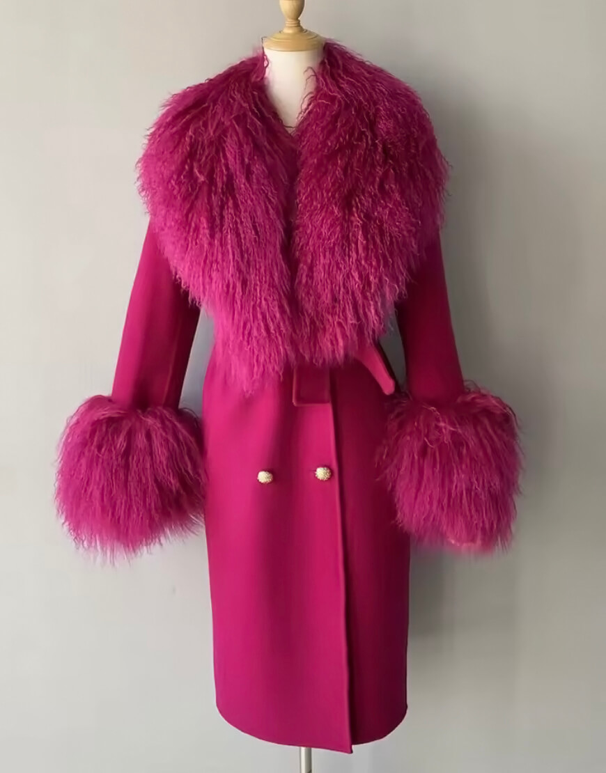 El ABRIGO ELENA Frambuesa de LUISON combina lujo y funcionalidad. Este abrigo de doble cara con cinturón en cachemira y lana cuenta con un cuello de piel de oveja mongol auténtica.