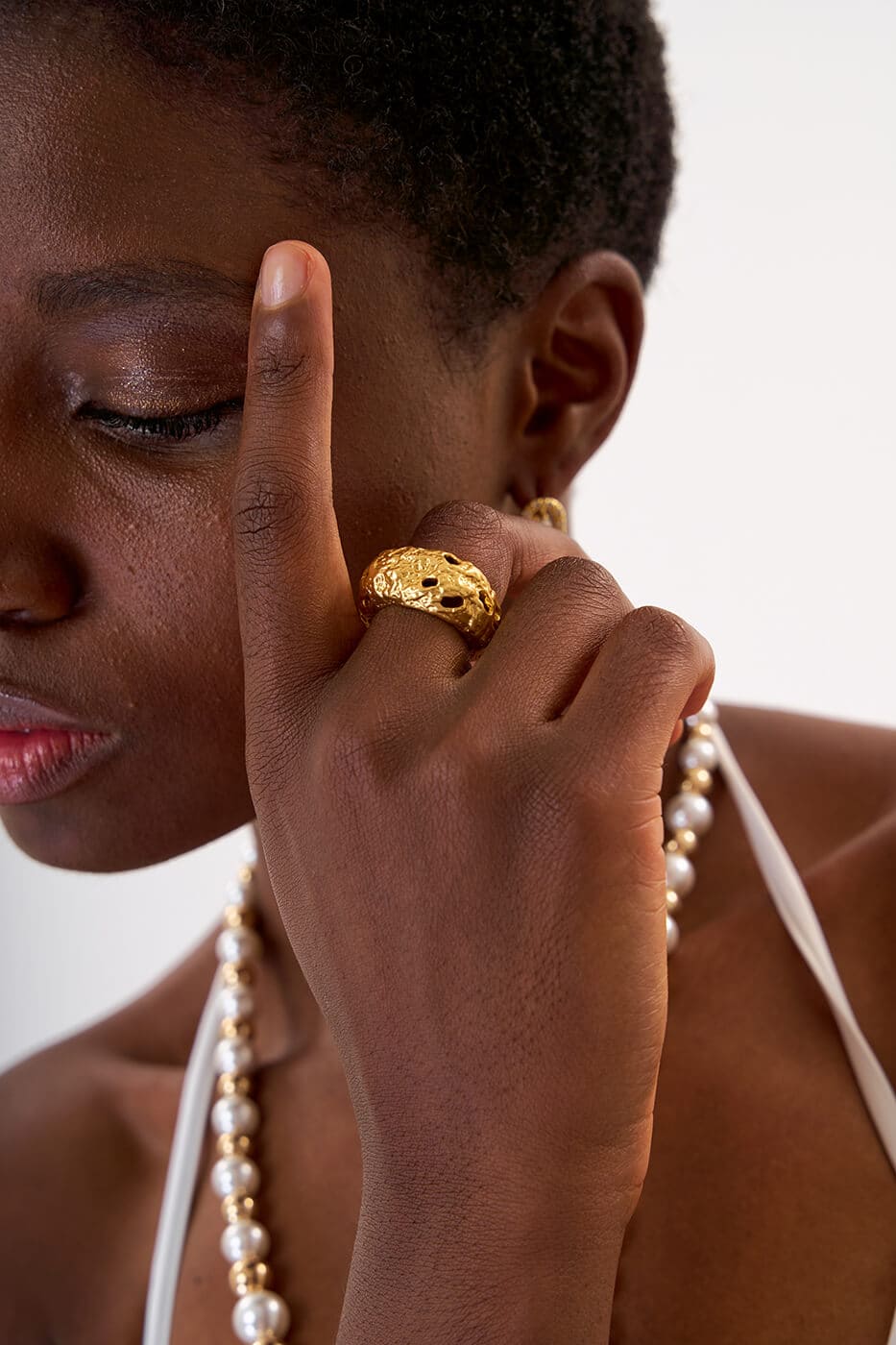 Totalmente elaborado a mano, este anillo unisex está fabricado en plata de ley laminada en oro de 18K. Su superficie martillada crea un efecto facetado que refleja la luz de manera espectacular, aportando textura y sofisticación. Perfecto para quienes buscan un accesorio atemporal con un toque moderno y artesanal.