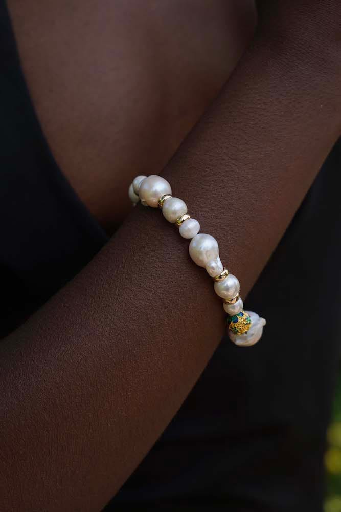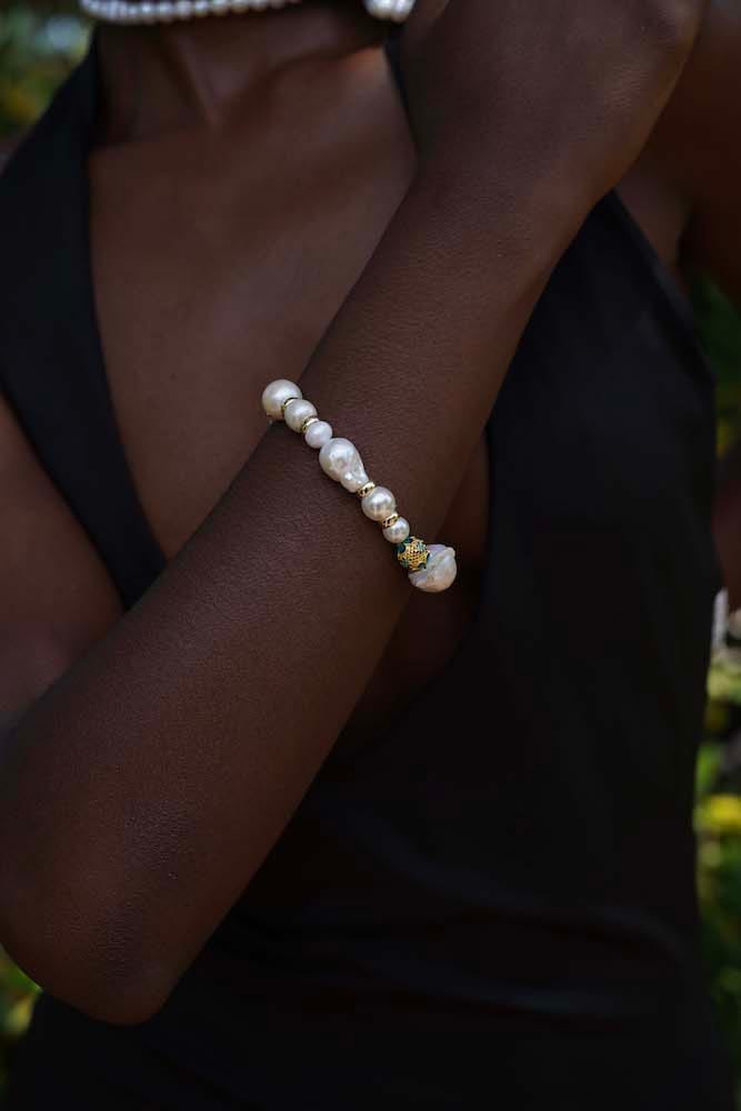Elegante brazaletes  elaborado totalmente a mano artesanalmente, elaborado con perlas naturales, 100 % originales, color blanco de 10 mm de tamaño con precioso detalle de una gran perla barroca, en forma de corazón totalmente Chapada, en oro 18 K con detalles en su orden en forma de gotas en color blanco chapado en oro 18 K creando un estilo y diseño único y personalizado añadiendo con último detalle un hermoso colgante con el emblema de la línea.