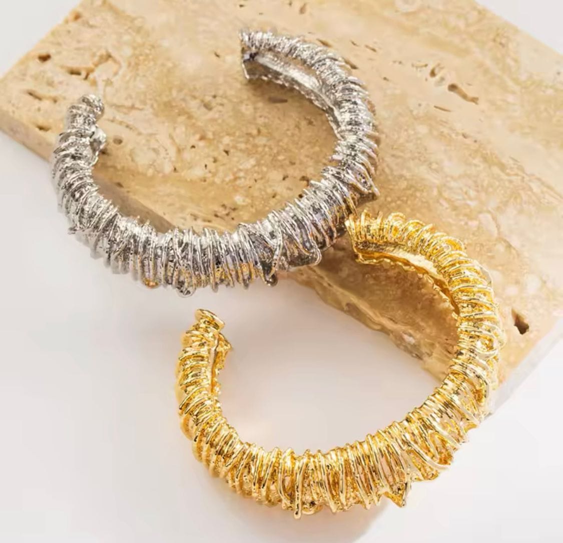 Brazalete dorado abierto de metal con textura irregular y diseño inspirado en líneas tejidas. Su acabado Vintage y su estilo Retro europeo lo convierten en el accesorio ideal tanto para mujeres como para hombres. Fabricado en aleación de alta calidad, este brazalete combina personalidad y originalidad, perfecto para fiestas, regalos especiales y looks sofisticados.