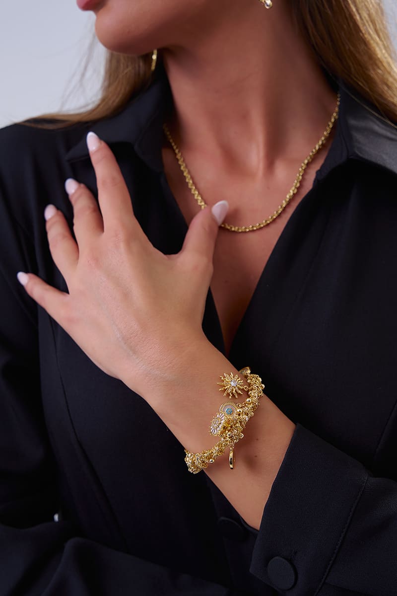 El brazalete VIDA es un accesorio unisex elegante y sofisticado. Está elaborado con cadenas de eslabones de plata esterlina laminada en oro 18k entrelazadas entre sí, creando un diseño dinámico y moderno. Incluye colgantes decorativos de plata chapada en oro 18k con bordado incrustado de cristales de circonio natural y relieve interno con concha de abulón blanco natural, aportando un toque exclusivo y armonioso.