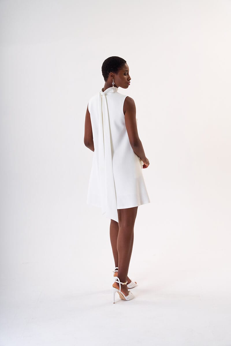 Vestido corto unisex de color blanco con estampado floral y apliques de perlas, cuello alto sin mangas. Diseño artesanal y femenino de LUISON.