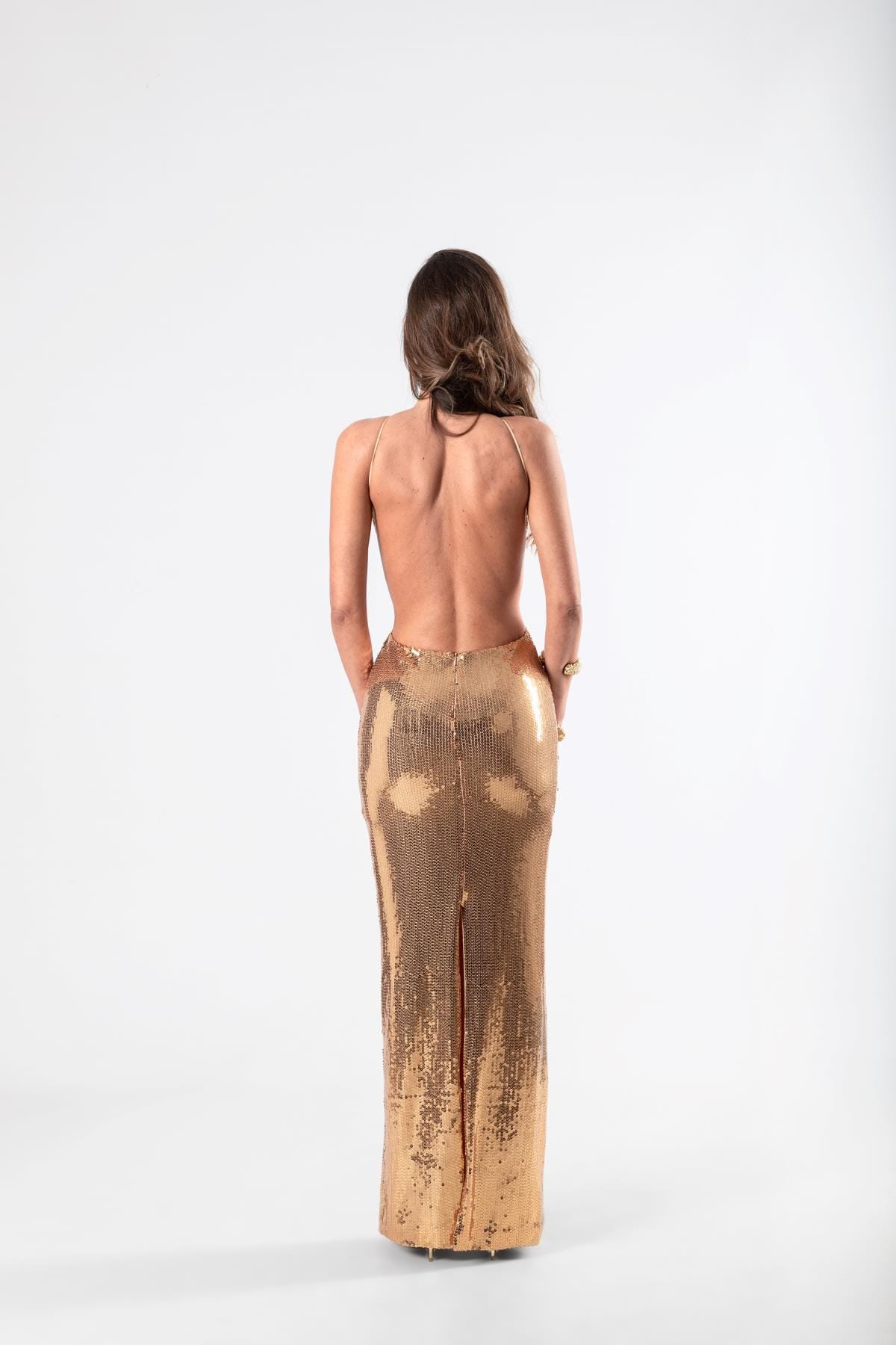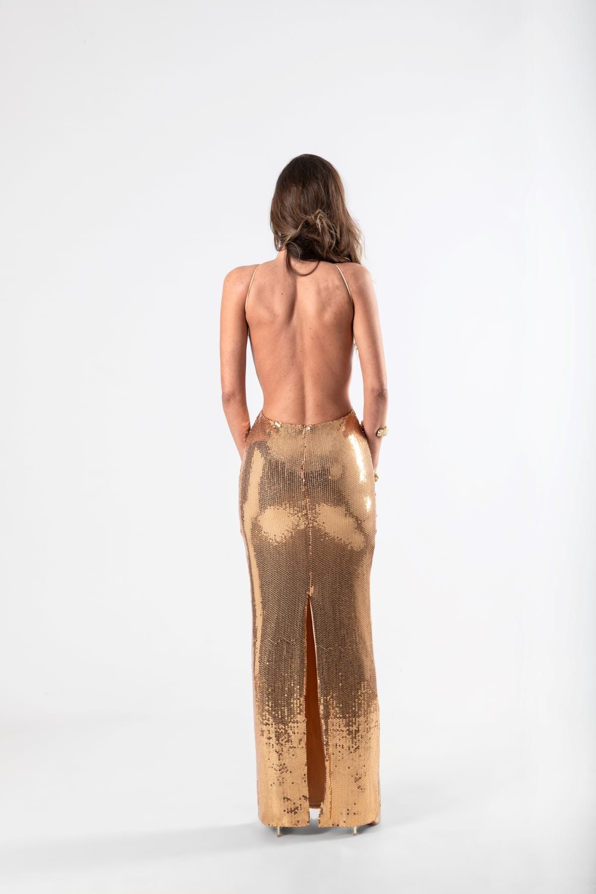 Un vestido largo dorado, adornado con lentejuelas, presenta un diseño elegante y audaz. Su escote profundo con tirantes cruzados en el cuello y los cortes laterales estilizan la figura, ofreciendo un toque sofisticado y sensual. Perfecto para eventos de gala o noches especiales.