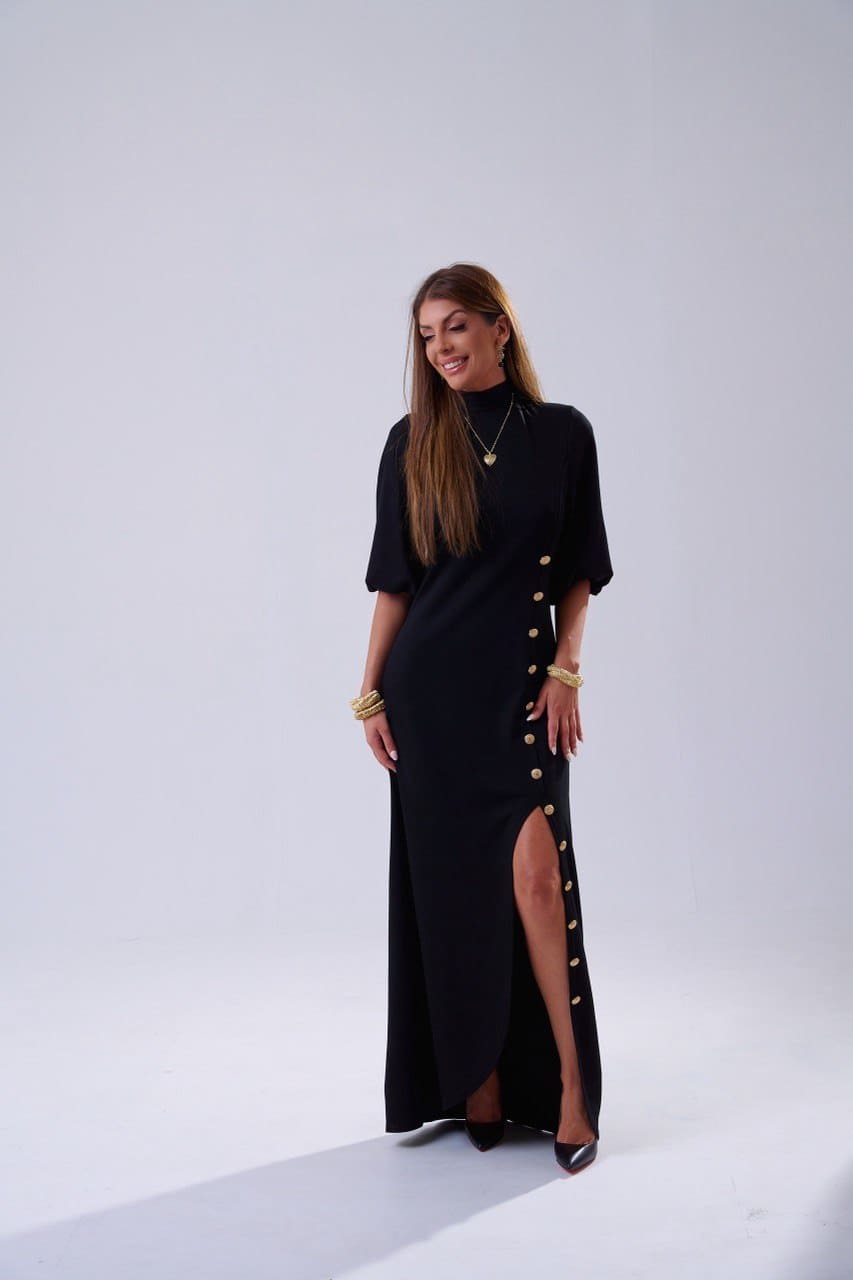 Vestido Lety | Vestido largo negro de noche con abertura y botones dorados
